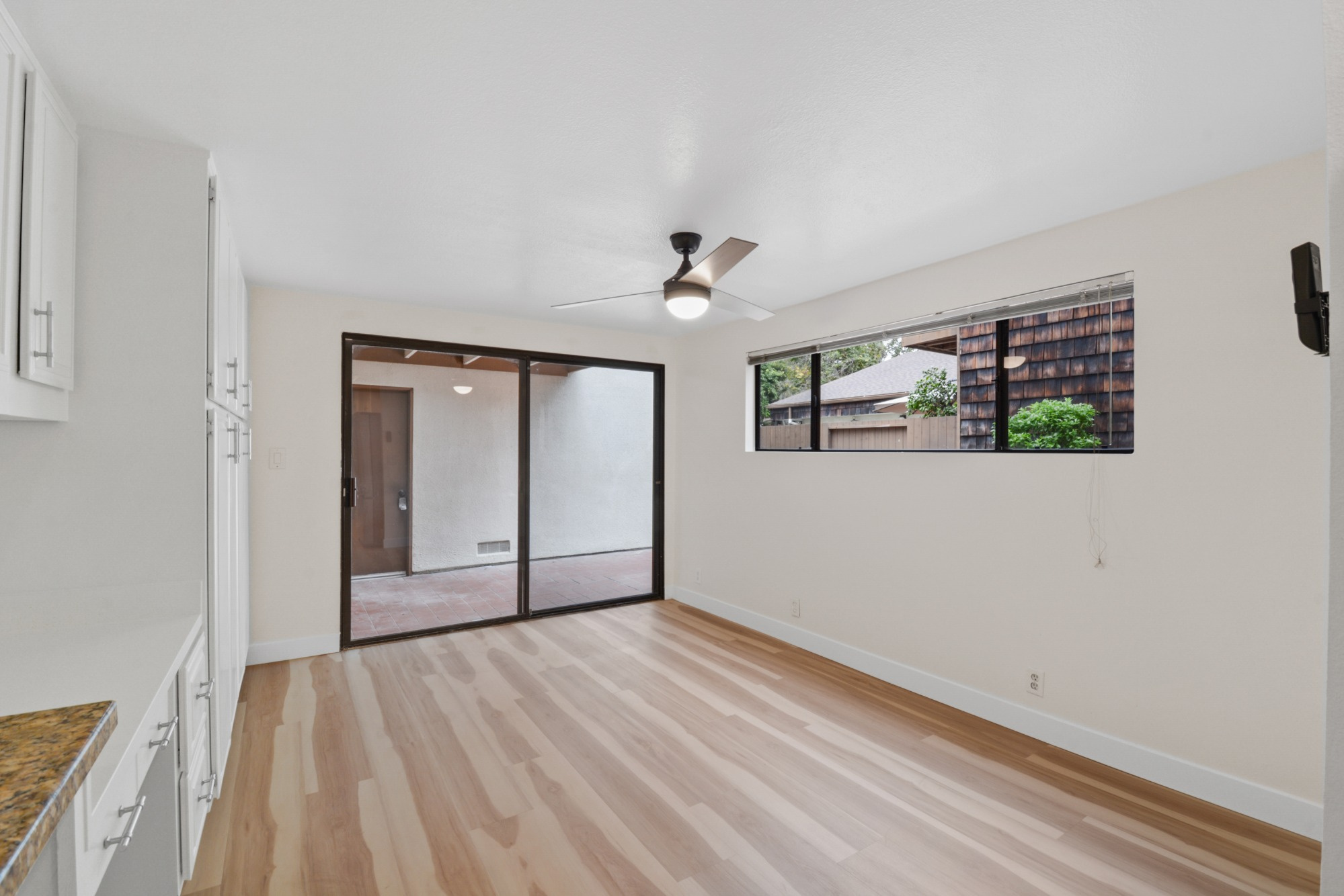 This home is designed for comfort and convenience with central air and heat, dual-pane windows and sliding doors, plantation shutters vertical blinds and an inside laundry area with washer and dryer included. A private gated entry leads you to a serene and tranquil backyard patio with peaceful tree views. The property also includes a detached 2-car garage with a new garage door opener.